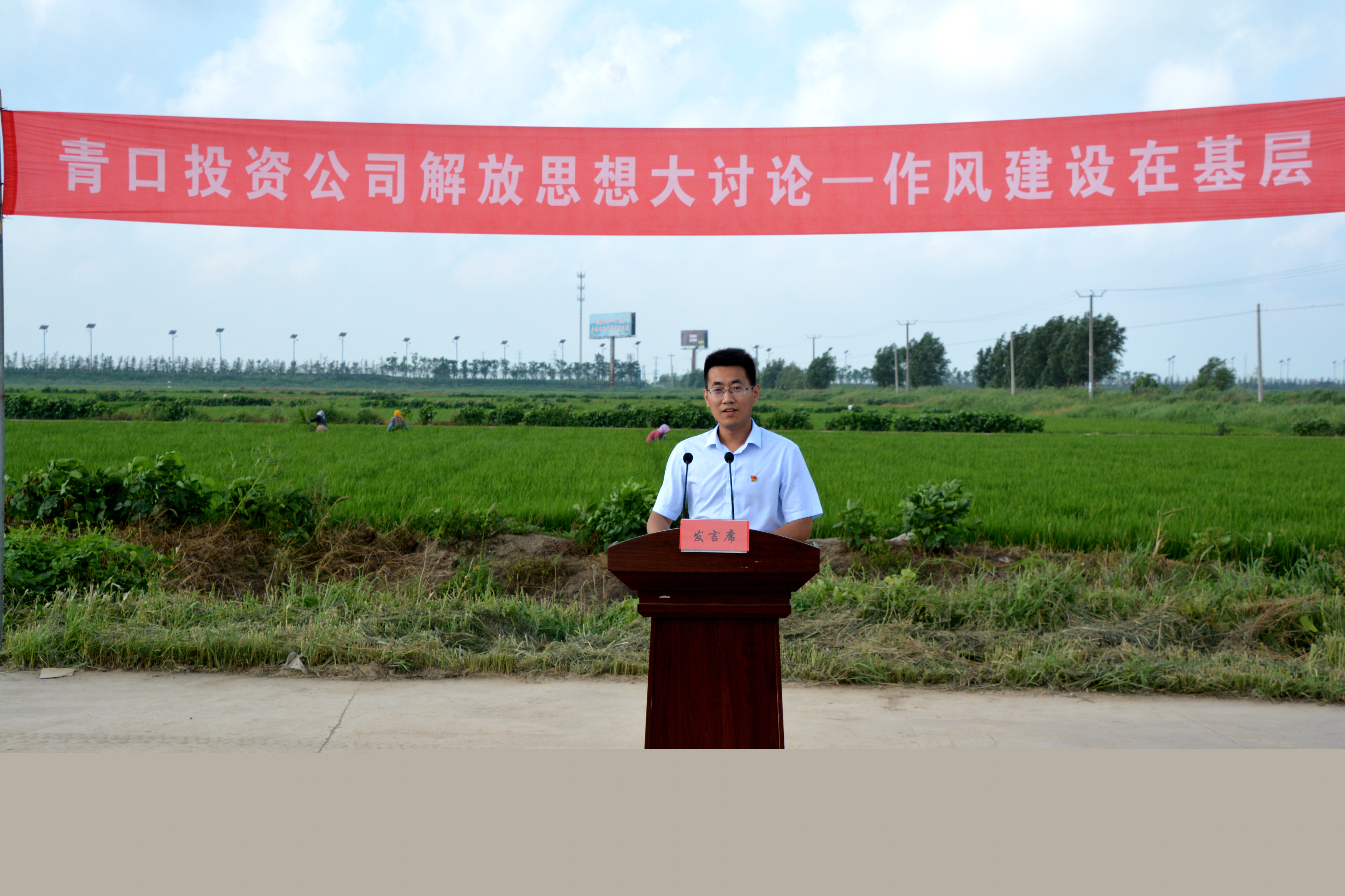 八月盛夏,高溫持續(xù)。清晨五點(diǎn)多,旭日剛剛升起,青口投資公司萬(wàn)畝“鹽稻”在陽(yáng)光照耀下美如畫卷,該公司大新農(nóng)場(chǎng)田頭已經(jīng)沸騰起來(lái)了。只見(jiàn)橫幅早已高高掛起,人員也悉數(shù)進(jìn)場(chǎng),不時(shí)傳來(lái)調(diào)試音響的聲音,一場(chǎng)接地氣的“作風(fēng)建設(shè)在基層”論壇就在這里拉開(kāi)帷幕,八十余名干部職工在藍(lán)天白云下感受了這場(chǎng)別開(kāi)生面的“田頭論壇”。