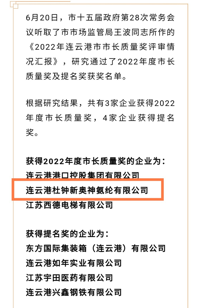 經過自愿申報、資格審查、資料評審、現場評審、綜合評價審定公示和政府研究品準共7個環節,最終620日,連云港市市物價局政府第28次常務會議聽取了連云港市市場監督局王波所做的《2022年連云港市市長質量獎評審情況匯報》,研究通過了2022年度市場質量獎和提名獎的名單,確定了3家企業獲得2022年度市長質量獎、4家企業獲得提名獎,我公司榮獲2022年度市長質量獎。