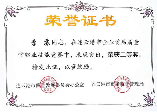 為貫徹落實省委政府《江蘇省質(zhì)量提升行動實施方案》精神,進一步推動連云港市企業(yè)高質(zhì)量發(fā)展,市質(zhì)量發(fā)展委員會辦公室和市市場監(jiān)督局聯(lián)合與6月份舉辦了2022年連云港市企業(yè)首席質(zhì)量官職業(yè)技能競賽。氨綸公司代表李蘇同志發(fā)揚勇于拼搏、不驕不躁的競賽精神,獲得了此次競賽二等獎。