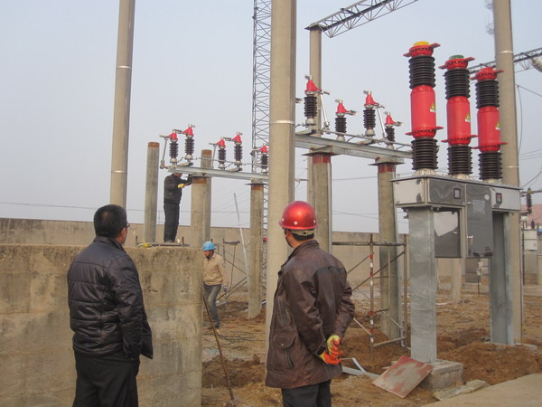 圖為工人們在安裝斷路器