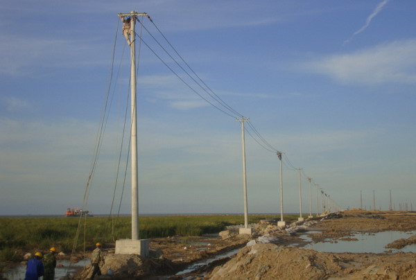 連云新城三期供電線路緊貼海堤邊。受海堤建設進度和海風海潮的影響,低矮的壩堤經常被風刮起的海浪浸頂,石塊突起,洼水漣漪,淤泥纏足,堤邊路面凹凸不平,道路僅限一輛車通行,擁擠不堪,工程施工難度極大。為提升速度,加快進度,臺北供電所克服困難,緊鑼密鼓地展開工作,以期早日完工。現場勘察地形地貌,了解潮汐運動規律,制定施工計劃,設計措施方案,組織人力,采購材料,投入施工。施工人員采用彈性工作時間,利用落潮時機,搶運電桿,及時立桿和裝配。職工們發揚不怕苦,不畏難的精神,不懼海風吹臉、海水浸衣,爬上距離海平面二十多米仿佛搖擺不定的高桿,懸在空中一絲不茍地操作,保障了工程的全面竣工。
