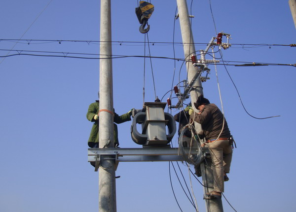 黃化制鈣公司居民區已有三十多年歷史,目前居住400多戶居民。由于使用年久老化,變壓器容量小、供電半徑大,線路長、線徑細,電壓不穩,供電效率低。加上居民生活水平提高,用電量增加,供電矛盾日益突出,嚴重影響空調、冰箱等家用電器正常使用,居民意見很大。考慮到這項工程需投資資金較大,而老居民區情況復雜、經濟上大多比較困難,為快速化解居民用電矛盾,讓他們過上祥和、舒心的春節,臺北供電所自籌資金,領導親自到現場勘察,擬定整改方案。該所人員全部出動,雇用工具車三臺、吊車兩輛,運送一臺100千伏安變壓器、兩個配電箱和10根電桿,自帶導線等材料趕赴施工現場。在居民的支持和配合下,克服了巷口復雜、圍墻歪斜、樹枝凌亂、布局很不規則等困難,奮戰多日,安裝一臺新變壓器,將原來的一條線進入改為三條線進入,增加供電功率,擴大供電容量。通過進戶測試,均達到用電標準,給居民帶來了冬天的溫暖。