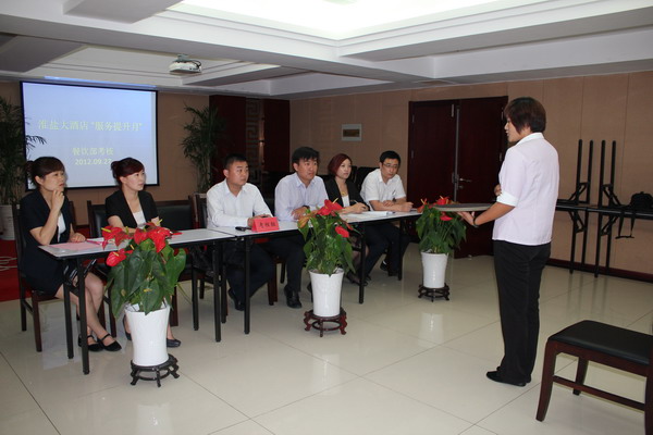 七、八月份的旺季大客情剛過,該酒店伏運余總經(jīng)理就召開經(jīng)營管理會議,籌劃在9-12月期間,分別開展“服務(wù)提升月”、“出品質(zhì)量月”、“管理提升月”、“安全生產(chǎn)月”等4個“主題月”活動。要求各部門根據(jù)每月的主題,組織開展活動,進一步提高酒店各個方面的工作和接待服務(wù)質(zhì)量,為明年乃至今后的發(fā)展打下堅實基礎(chǔ)。該酒店制定了主題月活動的詳細工作計劃,以培訓為龍頭,帶動全方面服務(wù)提升。在九月份的“服務(wù)提升月”中,部門經(jīng)理及以上管理層直接授課,同時邀請了神州賓館等高星級酒店的管理人員前來授課,共培訓120個課時、1000人次。培訓真正使員工加強了業(yè)務(wù)知識、提高了服務(wù)意識、開拓了工作思路。(楊帆)
