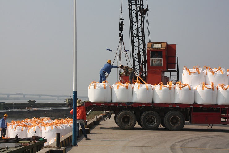 10月6日上午9時許,隨著一聲汽車長笛,一輛載有近40噸化工物資的卡車徐徐停靠在宵洋物流公司五灌河碼頭邊,緊接著碼頭鐵臂起舞,機械操作工宋成龍、楊棟梁嫻熟地操縱著塔吊機械,王緒銀、駱公友等職工敏捷地指揮吊臂準確地將一包包噸貸物資裝卸在碼頭邊的貨船中。。。。。。自此,一輛輛滿載噸袋物資的卡車便不停地駛進碼頭。