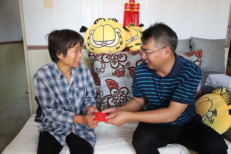 “現(xiàn)在身體還好嗎?兒子現(xiàn)在怎么樣?”在困難群眾于蘭英家里,王德志董事長一進門就關(guān)切的詢問她的生活狀況。“感謝公司黨委的關(guān)心和照顧,目前家里一切都好。”看到王德志董事長的到來,于蘭英有些激動的說道。