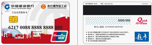 工會會員服務(wù)卡是一張集工會會員身份識別功能、會員服務(wù)功能于一體的工會會員實(shí)名服務(wù)卡。具體功能如下: (一)身份識別功能。工會會員服務(wù)卡具有工會會員身份識別功能,記載工會會員基本信息,全市工會會員實(shí)名制動態(tài)管理。 (二)工會服務(wù)功能。工會會員服務(wù)卡具有劃入存貯工會所有幫扶救助資金的服務(wù)功能,持卡會員還可免費(fèi)或優(yōu)惠享受工會組織提供的困難幫扶、職業(yè)介紹、技能培訓(xùn)、心理咨詢、勞動爭議調(diào)解等服務(wù)。 (三)金融服務(wù)功能。工會會員服務(wù)卡具有銀行借記卡的所有功能。 (四)社會服務(wù)功能。工會會員服務(wù)卡整合部分社會服務(wù)功能,通過工會與加盟機(jī)構(gòu)合作,為持卡會員提供醫(yī)療保健、文化娛樂、商業(yè)購物、生活服務(wù)等領(lǐng)域的優(yōu)惠服務(wù)。(具體簽約單位見市總工會網(wǎng)站www.lygzgh.org/ka/) 下圖為工會會員服務(wù)卡卡樣,連云港市總工會發(fā)行的工會會員服務(wù)卡只此一種設(shè)計,請認(rèn)準(zhǔn)連云港市總工會logo和工會會員服務(wù)卡字樣,若同此圖不同均非工會會員服務(wù)卡。