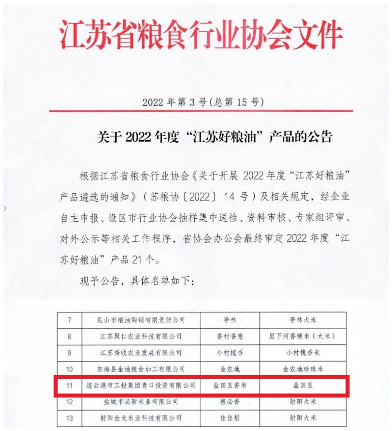 鹽田玉香米入選2022年度“江蘇好糧油”榜單!