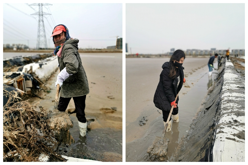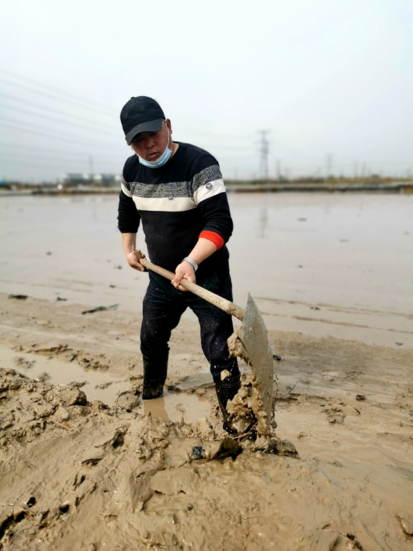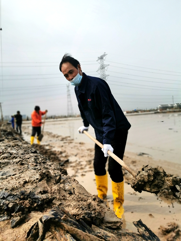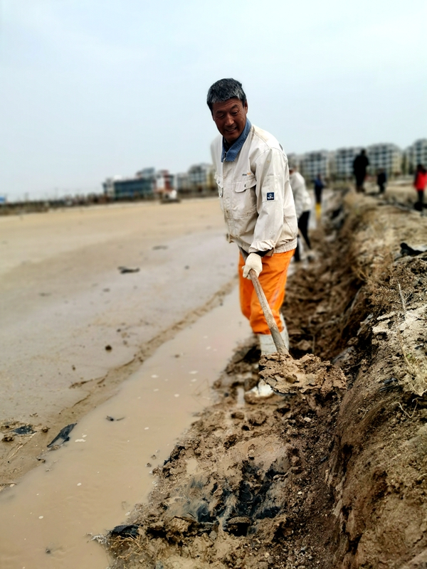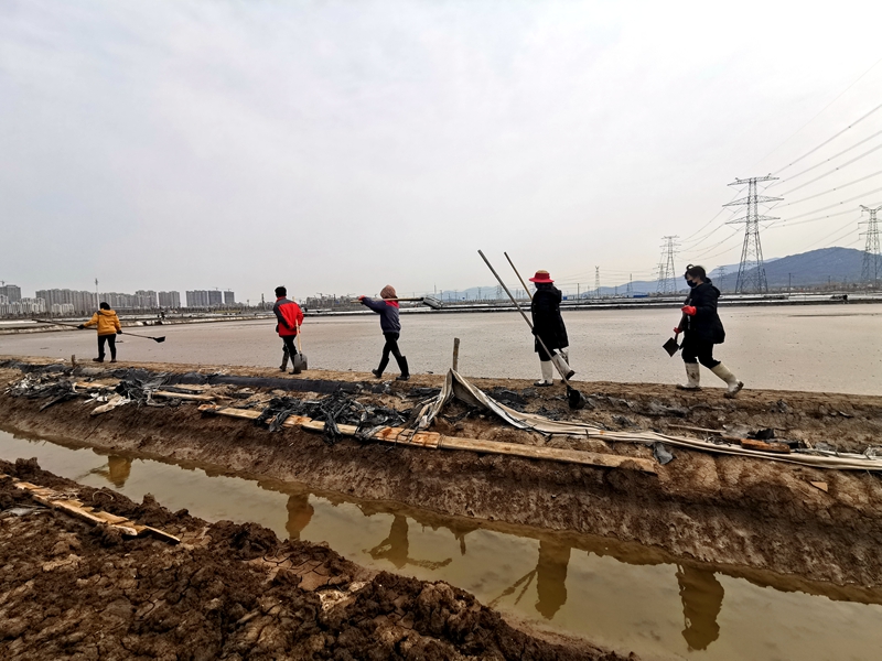 往東邊看,先鋒東灘黨旗招展分外鮮紅,海州灣公司18個(gè)單元職工、3名班組長(zhǎng)全員出動(dòng)馳援大浦工區(qū)協(xié)同重整410閑置鈣鹽灘地。引水入溝、翻泥上堰、腳踩和整、鐵掀蹋平,動(dòng)作嫻熟。1200余米的10條池堰僅用一天的就順利完工。