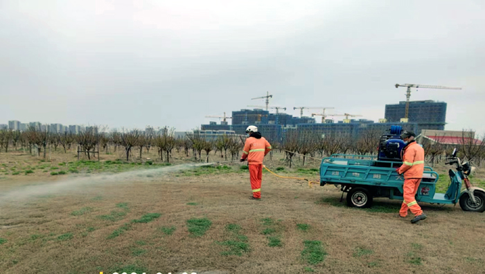 積極澆灌返青水。當(dāng)前,地溫回升快,苗木易萌芽,該班組采用“人工+機(jī)械”相結(jié)合的方式,全面啟動返青水集中澆灌工作,重點對園區(qū)喬木、果木、草坪等進(jìn)行全面灌溉,促進(jìn)苗木、草坪返青發(fā)芽。按照分種類、合理澆灌的原則,采取集中澆灌的方式最大限度減緩晝夜溫差對綠化植物的影響,入春后共澆水100余次,對落羽杉圓動力灌根2000棵,對大樹澆水1500棵,綠化澆水約30000平方米。